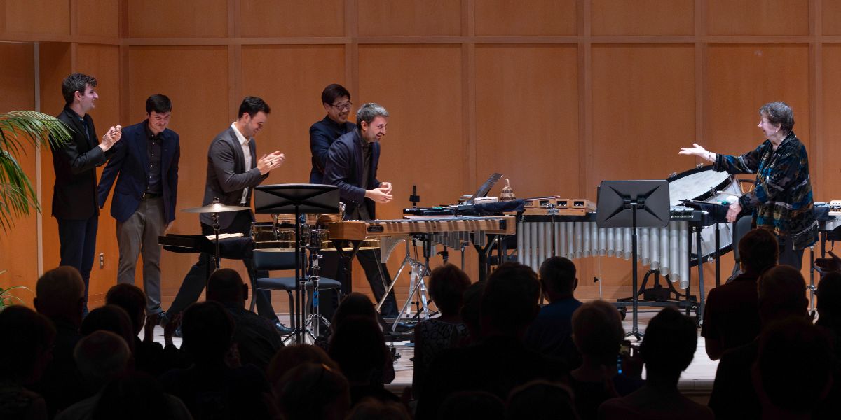 Sandbox Percussion and violinist Soovin Kim with Joan Tower. Photo taken after the world premiere of Tower’s To Sing or Dance at Chamber Music Northwest in 2024.